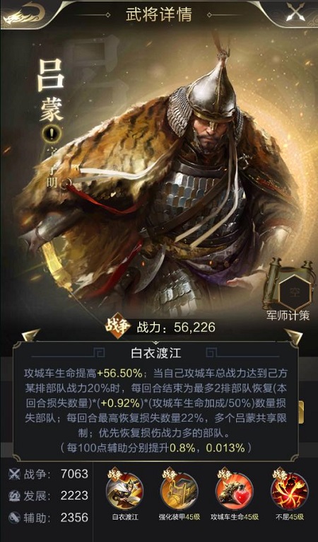 吕蒙专属技能【白衣渡江】,可以在每个回合结束时,为己方战损最高的两排部队恢复一定比例的战损,最高可达损失数量的22%。