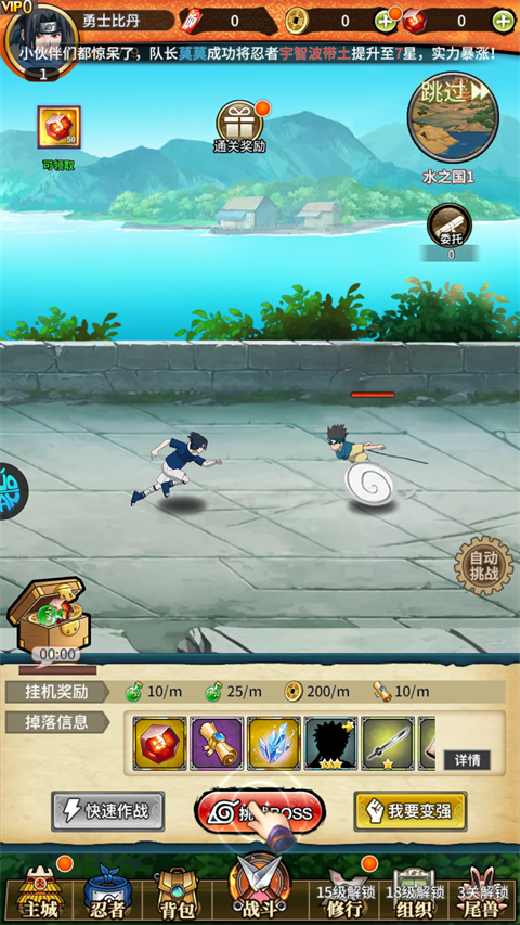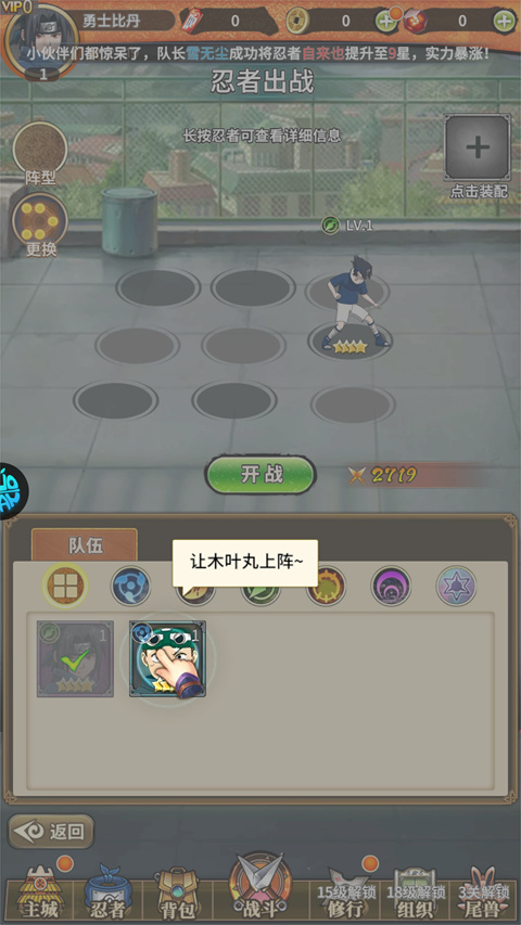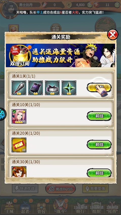 新手玩的话也不用担心,游戏有详细的教程。创建角色后就能开始召唤忍者,挑战各种BOSS。战斗中需要根据敌方的阵容来选择合适的卡牌忍者,打过指定关卡还能拿到奖励,成就感十足。