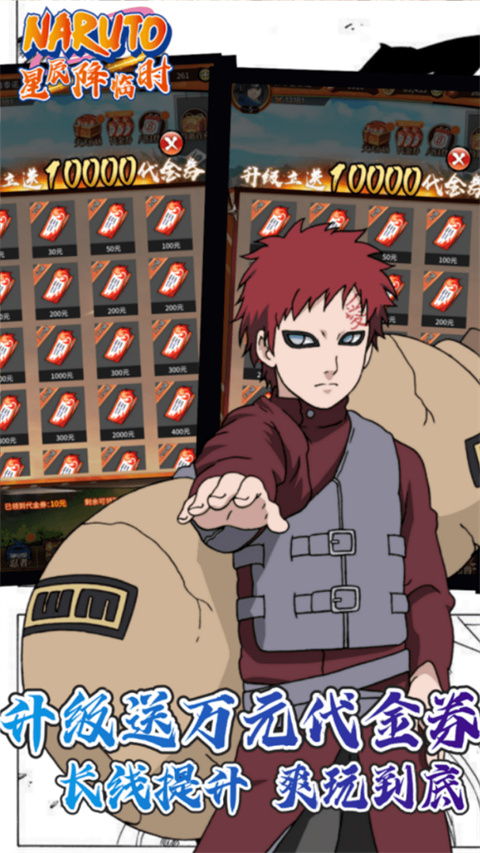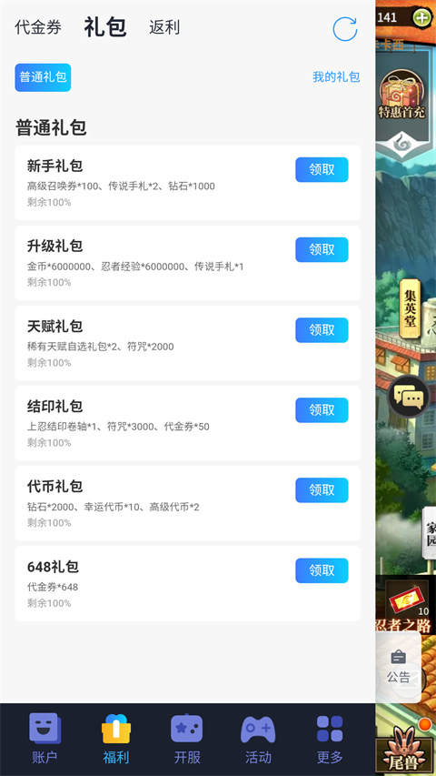 游戏的福利也挺多的,比如开局就送3000代金券,登录八天就能拿到七个强力忍者,还有大量材料和货币都是免费赠送。充值比例1:10,首充更是只要0.1折,感觉赚得盆满钵盈。每日登录、活跃还能再拿代金券和忍者自选包,福利真的太丰厚了。