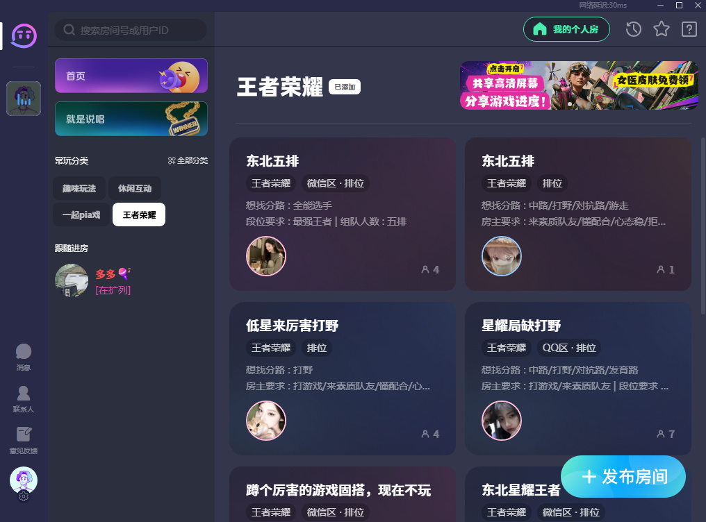 2、在首页右上角点击"我的个人房"即可直接进入个人房间。如果想创建新房间,可以在游戏大厅中选择想要玩的游戏,点击右下角"发布房间",选择房间类型并命名房间。