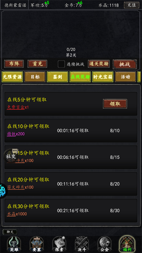 6、每天上线,在线奖励也可多水晶,另外签到也能获得。