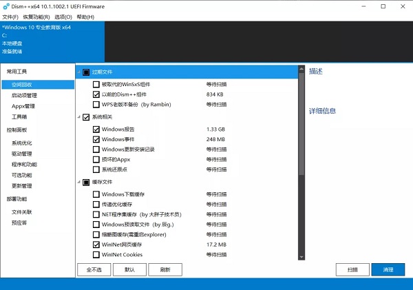 空间回收顾名思义就是系统清理功能,软件内置了多种清理选项,用户可以自由选择需要清理和扫描的选项内容,勾选相应选项之后,先进行扫描,扫描完成之后再开始清理。