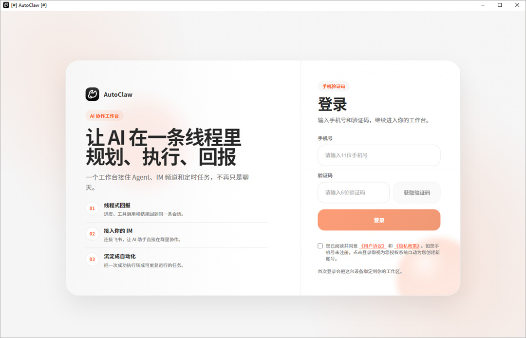 1、登录成功后,你将进入 AutoClaw 的主界面。