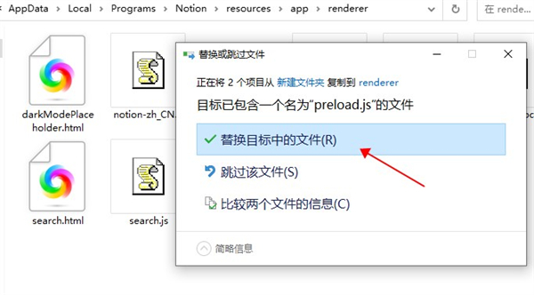 3、然后将压缩包中的notion-zh_CN.js和preload.js文件复制到Programs\Notion\resources\app\renderer里面进行替换。