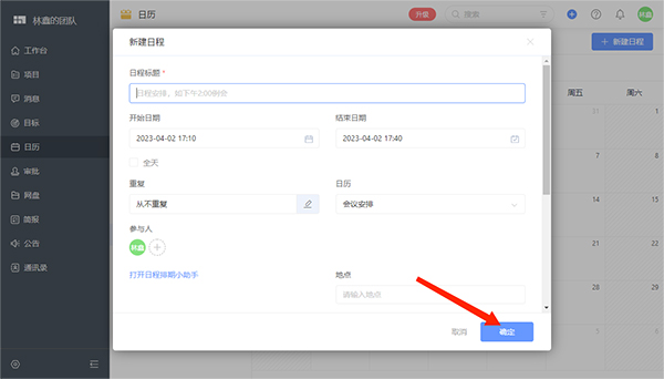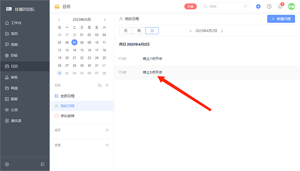 1、打开worktile软件,选择【日历】栏目,选择【新建日程】选项,