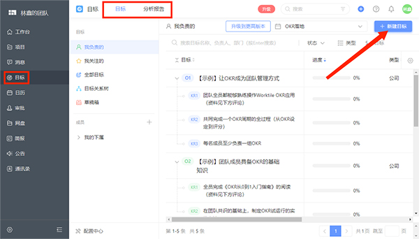 5、进入【目标界面】,包括【目标】和【分析报告】栏目,在【目标】栏目用户在这里可以看到【我负责的】、【我关注的】、【全部目标】、【目标关系树】、【我的下属】以及【新建目标】,