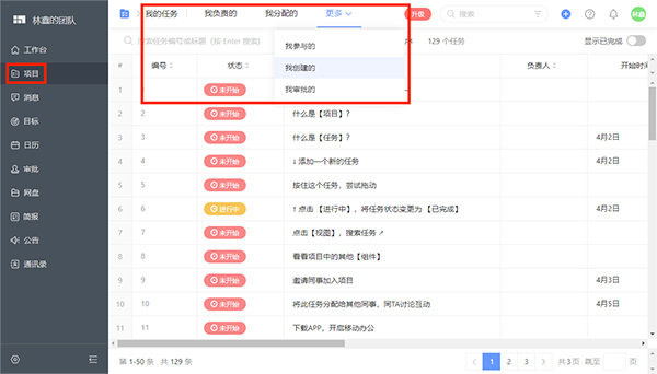 3、进入【项目界面】,用户在这里可看到【我负责的】、【我分配的】、【我参与的】、【我创建的】、【我审批的】所有项目,并且可以标注包括“未开始”、“进行中”、“整理纪要”的项目状态,