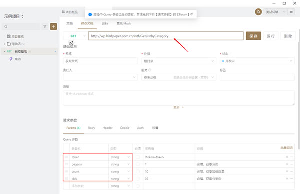 然后GET请求里面添加上链接,会自己填好参数字段,保存后运行即可。