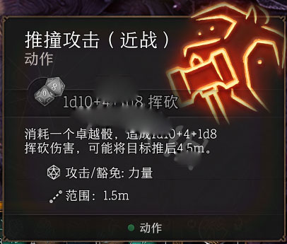 你以武器攻击命中敌人时,可以消耗一粒卓越骰以尝试将该目标推开。使用此战技时,你将所消耗的卓越骰加在此次攻击的伤害掷骰中。如果该目标为大型或更小体型,则其必须进行一次力量豁免。豁免失败者将从远离你的方向被推开 4.5米。