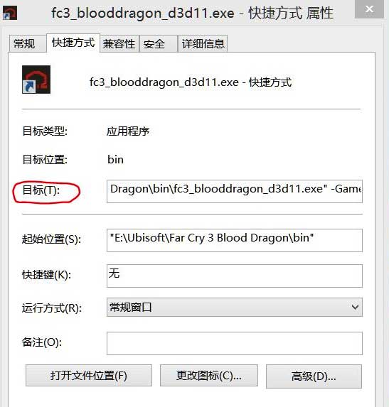 建一个游戏启动程序 fc3_blooddragon.exe ( 或fc3_blooddragon_d3d11.exe)的快捷方式,右键快捷方式,查看属性