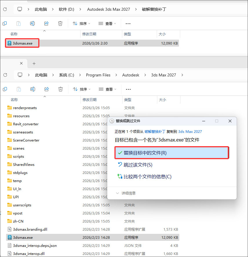 7、再将替换补丁文件夹下的补丁文件3dsmax.exe复制至软件安装目录下替换即可激活软件;