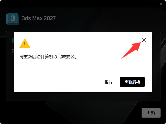 5、安装完成后,若提示【请重新启动计算机以完成安装】,点击X关闭即可;