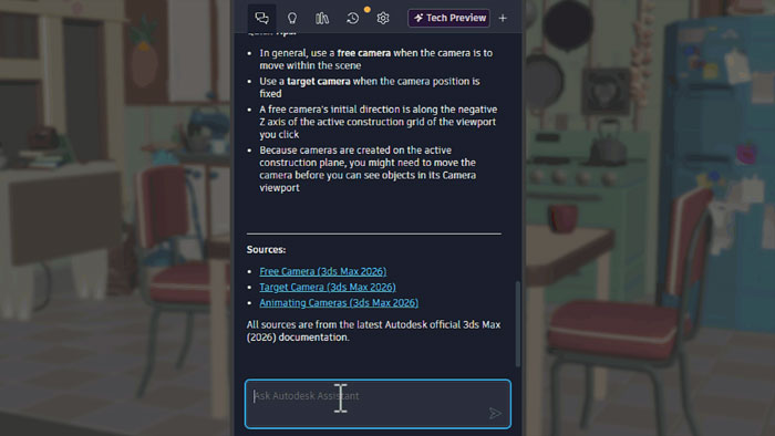 Maya 2027 引入了 Autodesk Assistant,这是一款由 AI 提供支持的工具,可帮助您直接在产品中快速查找有关功能和工作流的信息。