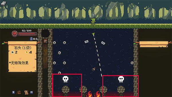 屏幕左上角会出现遗物,就是玩家已经获得的东西。屏幕左边还会有一个小垃圾桶,点击可以跳过当前发射的弹珠,使用下一个弹珠来发射。