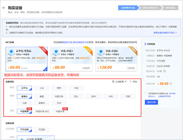 3、点击【新购设备】,进入设备购买页面,购买小众或宽带设备,比如注册亚马逊平台,设备地域和地区选择跟注册店铺的公司所在地一致。由于各平台政策存在差异,请根据平台政策谨慎选择合适的套餐,购买前请认真阅读【设备购买须知】以及套餐下发的套餐说明
