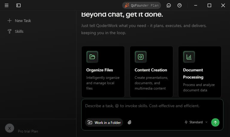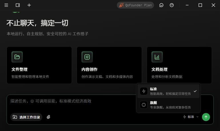 不只是问答。描述你想要的结果,QoderWork 自主规划、执行、交付。