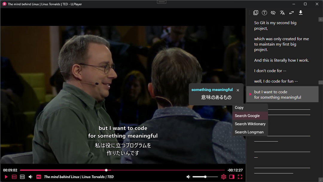 即时单词查询: 支持在播放时对字幕文本进行即时查词和浏览器搜索,并可与 Yomitan、10ten 等浏览器扩展程序集成。