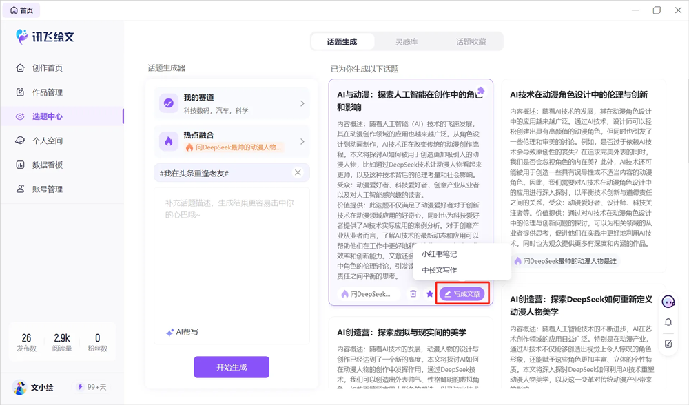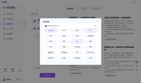 首页点击【选题中心】,进入【话题生成】页面。在【话题生成】页面,您可根据创作需求在输入框输入相应内容,如创作目的、创作背景等。也可点击【AI帮写】,讯飞绘文将根据您的赛道生成主题。