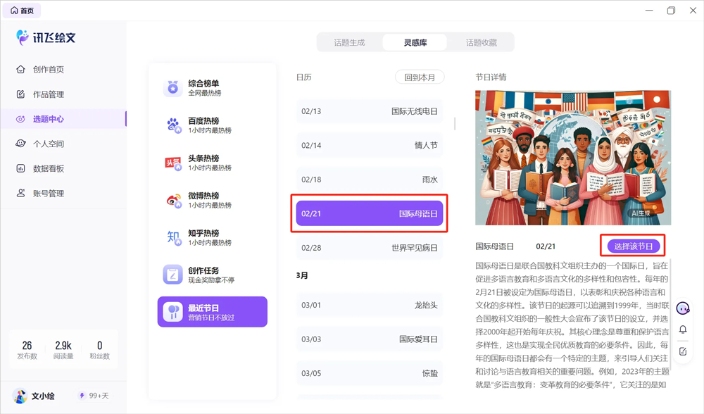 灵感库支持结合最近的节日生成相关选题,让您不放过每一个营销节点。