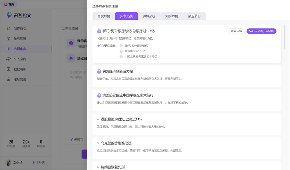 点击【热点融合】,您可以选择多个平台(百度、头条、微博等)的热点话题。