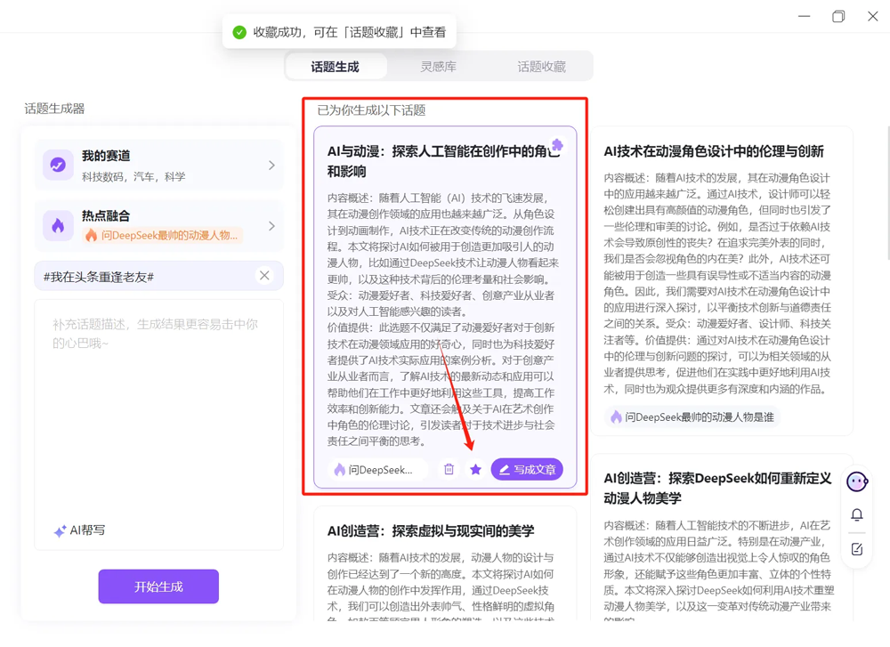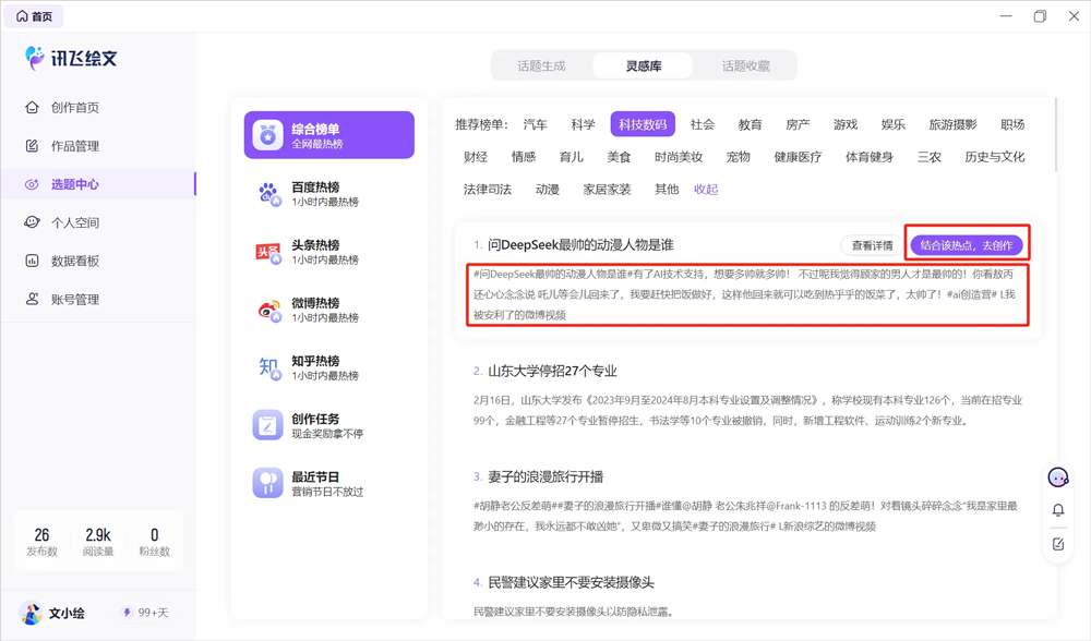 针对每个上榜的热门话题,【AI要点提炼】都为您总结好了关键的信息点,帮助您轻松玩转实时热点。点击【结合该热点,去创作】,灵感库将跳转至话题生成页面,并结合相关热点生成选题。