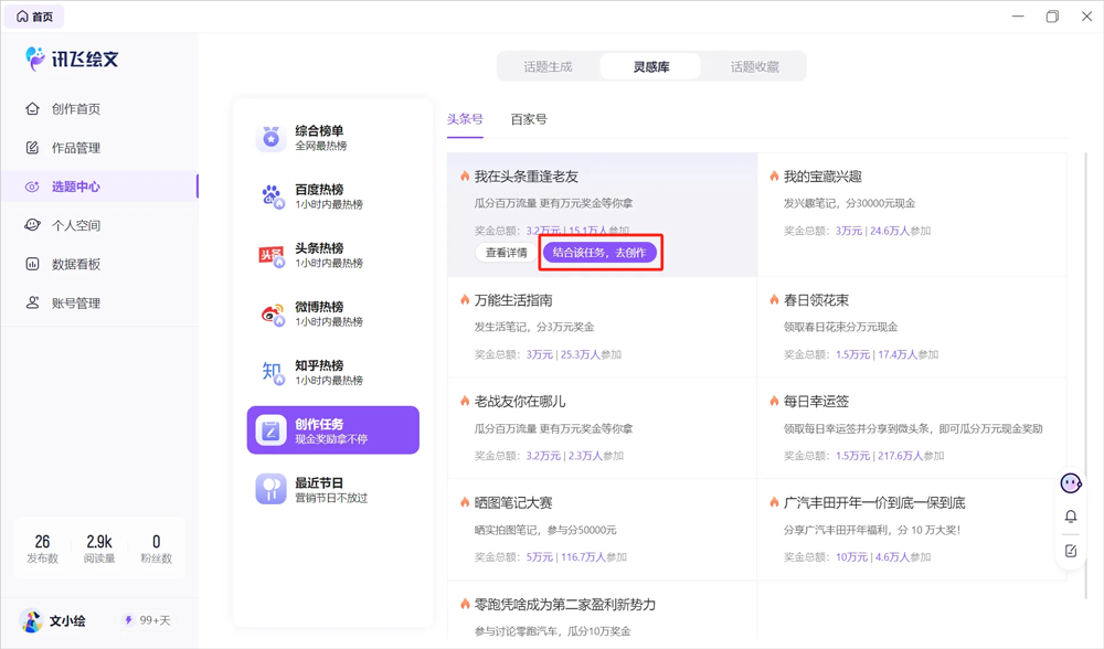 灵感库支持头条号和百家号的创作任务。点击【结合该任务,去创作】,即可基于任务话题,一键生成选题和文章,帮助您轻松参与并赢取奖励。