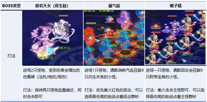 3.Boss关卡策略:boss分为三种类型:蝎子精、蜃气妖、般若天女(双生妖)。
