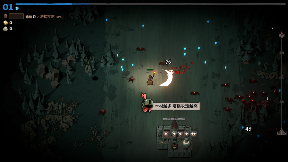 - 搜集:作为勤勤恳恳的劳工,除了面对源源不断的怪物大军,还得时刻权衡风险与收益,采集木材、石头和金子。可以不走寻常路,寻觅更丰厚的奖励;或是为了安全一路向南,直奔避难所而去。