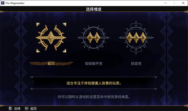 3、这里需要玩家自定义某些难度细节,玩家可以对游戏难度、敌方伤害倍速、敌方生命值倍速、自己生命倍速、自己伤害倍速进行微调,完成后选择并点击“E”键来开始游戏;