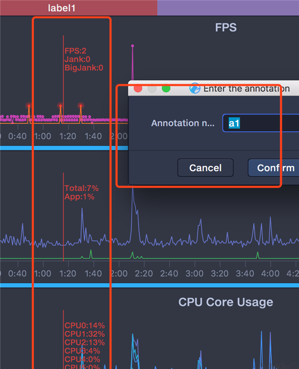 通过标签按钮给性能数据打标签,鼠标左键双击颜色区域可修改对应区域标签名