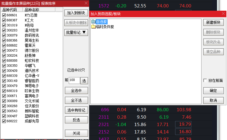 需要将某个板块或者行业加入到自选股中,可以使用批量操作: