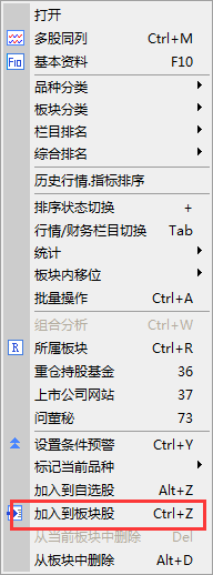 按前面介绍的方法找到需要的股票后,用鼠标右键点击它,从弹出菜单上选择〖加入到自选股〗或〖加入到板块〗,或按Ctrl+Z。删除自选股按ALT+D