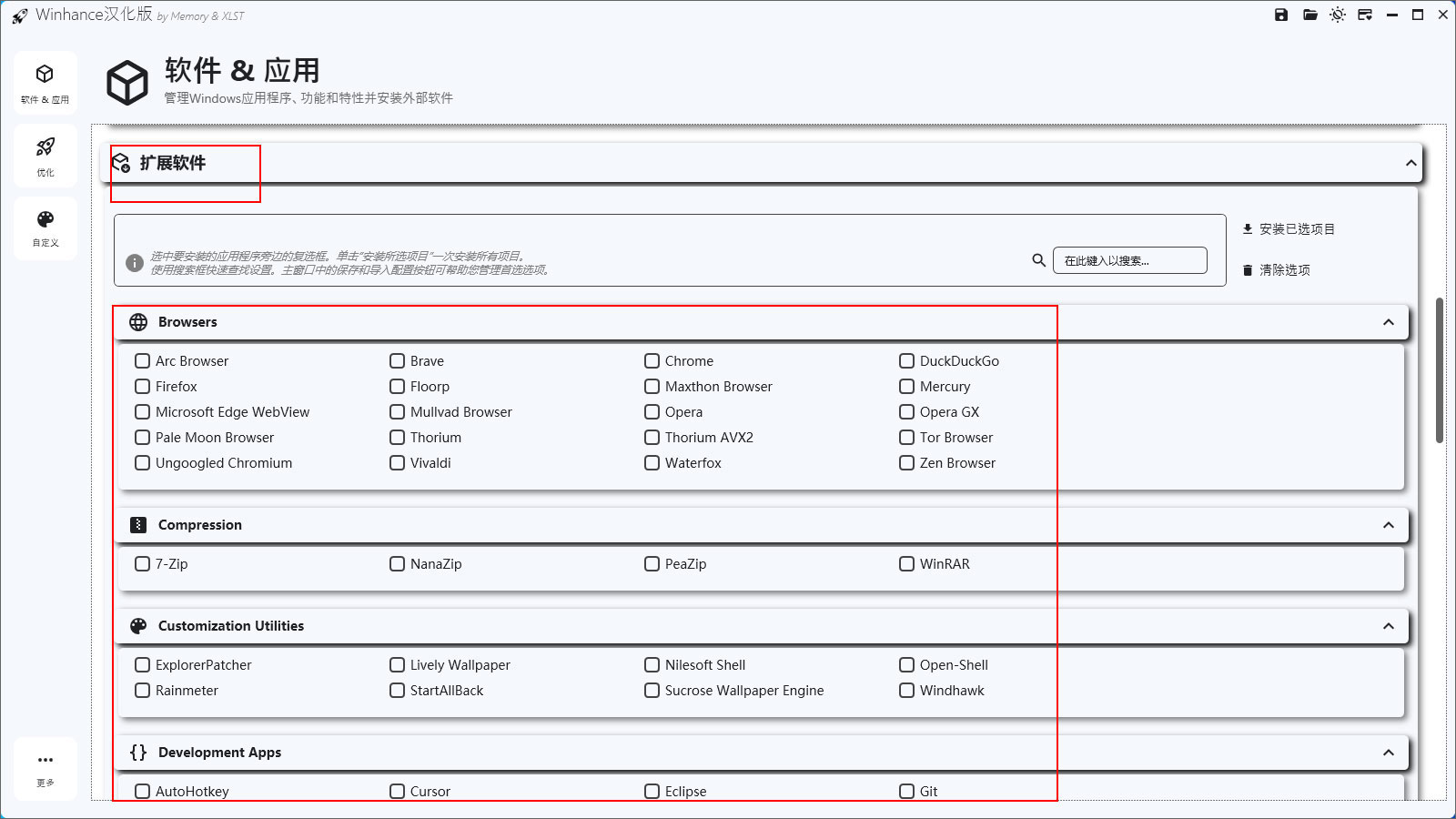 3、扩展软件:罗列了一个常用的第三方软件,做了一个专门的分类,全部都是广受欢迎的经典软件,例如谷歌浏览器、winrar等,可以很方便的选择安装。