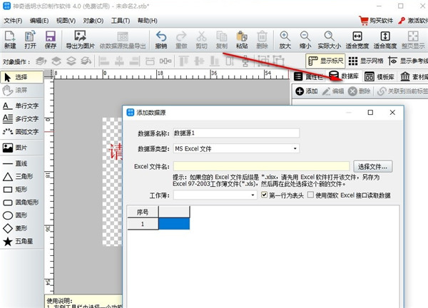 软件内置了很多工具,比如文字、图形、圆弧文字等,用户可以自由组合设计logo。特别是支持导入数据库文件(Excel、Access、SQLite),方便批量处理水印图片。这一点对需要高效处理大量数据的用户来说非常友好。
