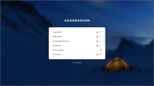 1、网络配置:开机后您可选择需要连接的网络,连接成功后 Rooms 展示绑定二维码;