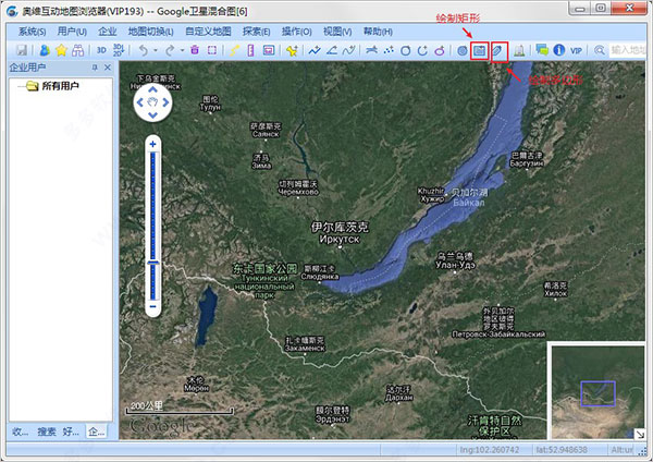1、首先打开在本站安装好的奥维互动地图浏览器,打开后在街面的工具栏中点击下图中的"绘制矩形"或者"绘制多边形"选项,来新建一个地图区域图像,以便于我们后续的导出工作;