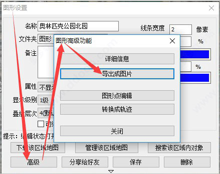 4、下载地图完成后我们在打开图形设置窗口,点击界面下方的"高级"选项,然后在弹出的弹窗中再点击"导出成图片"选项;