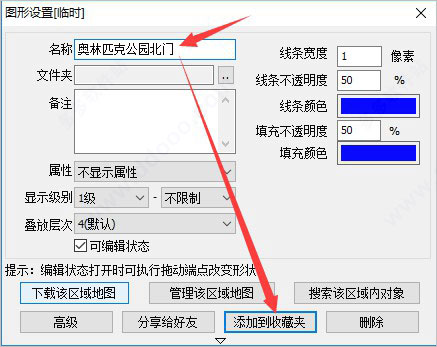 2、绘制完成图形后会弹出一个图形设置的界面,如下图所示,我们可以设置地图的名称、备注等其他信息,设置完成后再点击界面下放的"添加到收藏夹"选项;