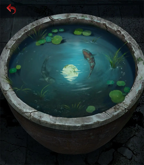 3、跟阿婆对话后,把阴阳玉佩交给她,换取一包鱼饲料,把鱼饲料撒进庭院里的大缸中,有月亮的影子映出来,用勺子去挖,获得黄珠子。