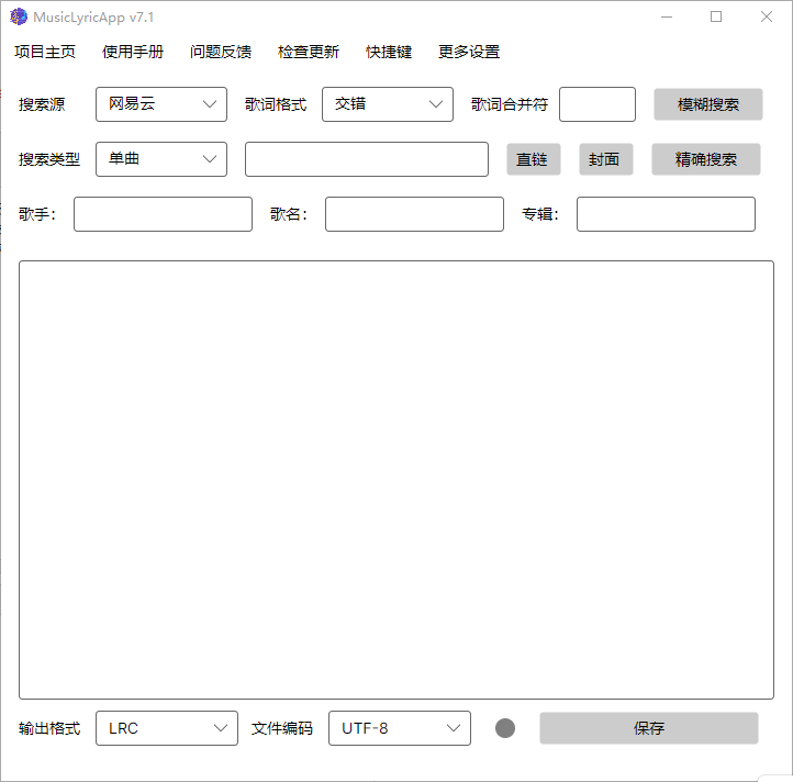 让我觉得挺方便的是它的操作简单直观,用户只需要输入链接就能快速提取歌词并保存到本地。软件界面友好,还有快捷键可以提升效率,比如使用Enter进行精确搜索,Ctrl+S保存结果等。