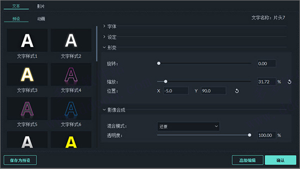 在“文字”编辑面板中,自定义文本(更改字体,大小,颜色,位置或动画)后,单击“保存为预设”。在弹出的“预设对话框”窗口中,输入新预设的名称,点击“确定”保存。您可以把自定义文本效果保存为预设,方便后续从“文字”库内自定义分类下找到文字模板样式效果快速使用。