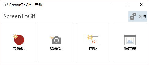 1、ScreenToGif绿色便携版是免安装软件,双击打开软件弹出一个启动窗口,录制摄像头、录制画板和进入编辑器四个选项;