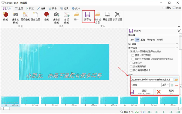 6、导出GIF图片:点另存为,在软件右侧弹出的界面配置好,输入保存的位置和名称保存,弹出的编辑器会提示进度;
