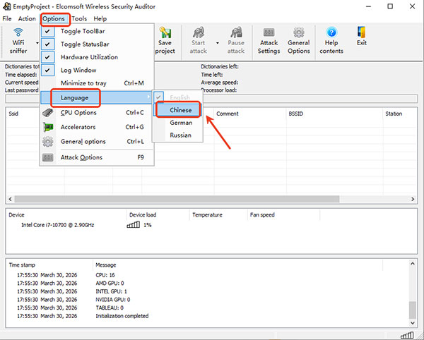 6、接着即可运行软件,选择Options--Language--Chinese,将其设置为简体中文;