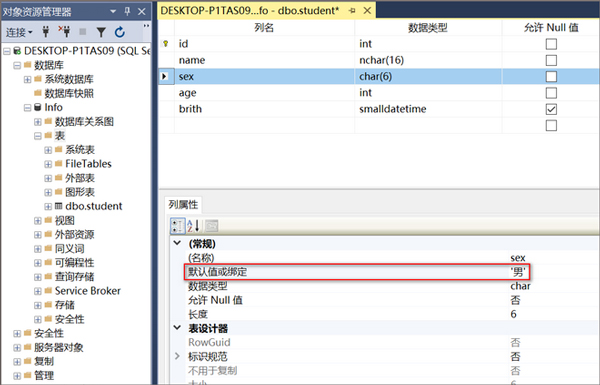 (4)默认约束:用于为表中的列指定默认值。选择表中"sex"行,在列属性中:默认值或绑定中输入值:'男',如下图所示: