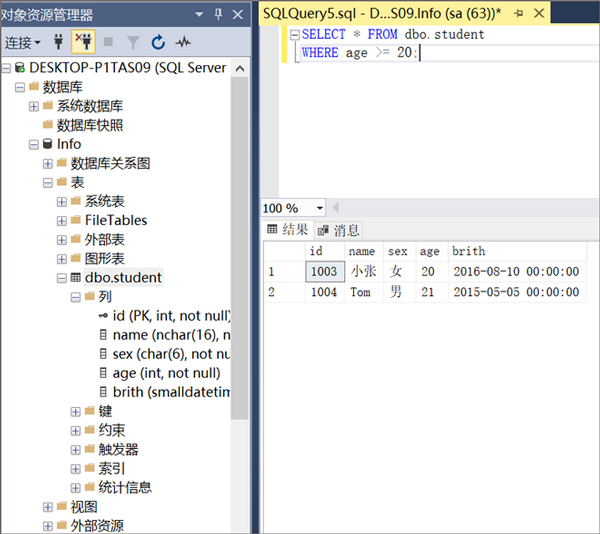 7、查询:右键单击数据库名Info,选择"新建查询",输入SQL语句,查询age>=20的所有内容,然后点击"执行",结果如下图所示