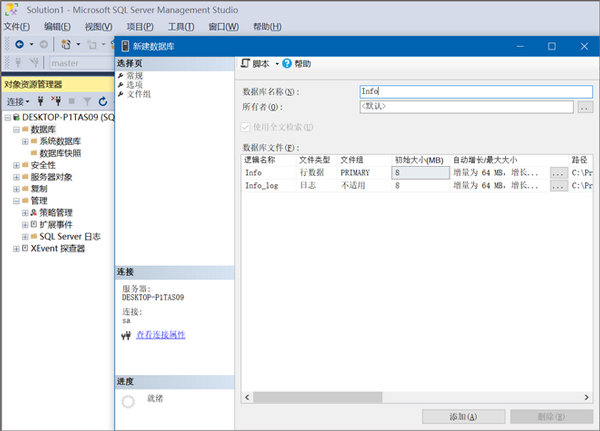 2、创建数据库:右键单击"数据库" --> 新建数据库:输入数据库名称,如Info,点击确定,如下图所示:可通过右键单击Info选择"属性"来修改数据库;数据文件:Info.mdf,日志文件:Info_log.ldf