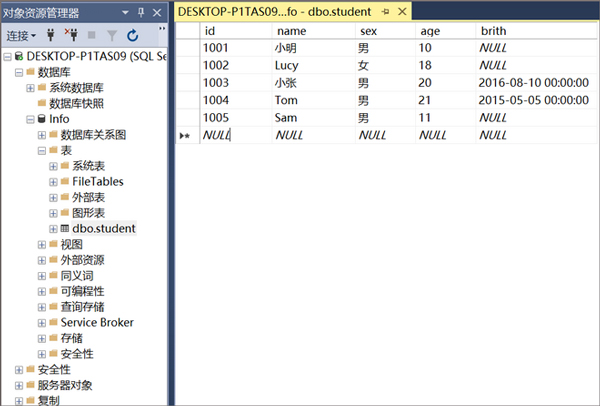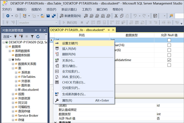 3、创建表:右键单击"表" --> 新建 --> 表:添加内容如下图所示:按Ctrl+S保存,表名为dbo.student,点击确定