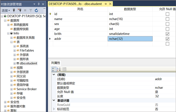 (1)添加列:右键单击表"dbo.student",选择"设计":选择"列名"列中的第一个空单元,在该单元中输入列名:addr,保存,如下图所示: