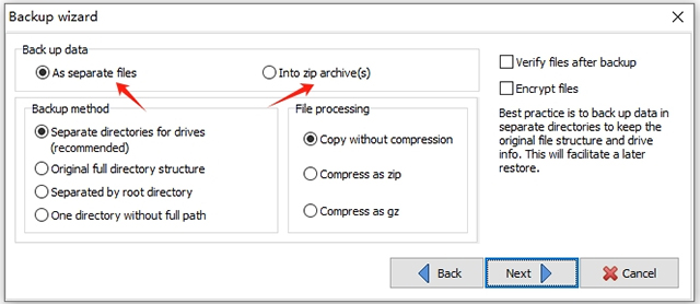 5、可以选择直接备份文件,也可以选择第二个压缩为zip文件,点击下一步。